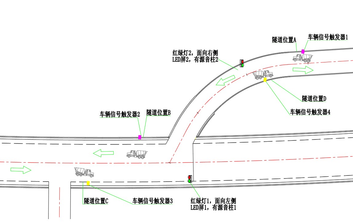 | 4 | 有源音柱 | 90W,有源感应触发音柱。 | 提示过往车辆“车道畅通,减速慢行”或“对面来车,禁止通行” |